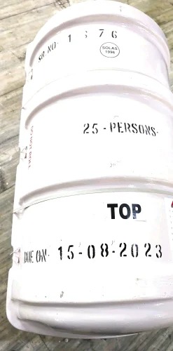 All liferafts on ships are fitted with the following equipment: Rescue quoits with minimum 30-metre lines. Non-folding knife with a buoyant handle. If the life raft holds more than 13 persons, then a second knife. For 12 persons or less, 1 bailer. .....